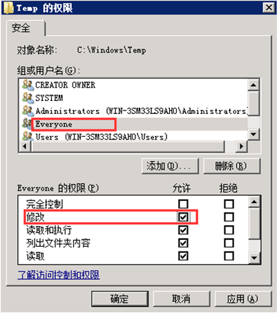 第三步,選中對象“Everyone”,并在權限中勾選“修改”對應的“允許”復選框。點擊“應用”及“確定”按鈕,如圖;