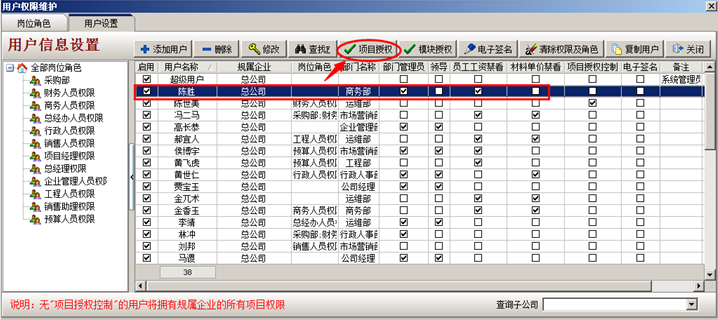 然后陳勝的項目授權,登錄超級用戶----系統維護----打開用戶管理權限設置,選中陳勝,設置項目授權