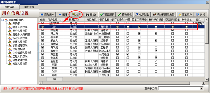 3、工程管理軟件中設置子公司員工:以員工陳勝為例講解,登錄超級用戶----系統維護----用戶管理權限設置。選中員工陳勝,點修改按鈕