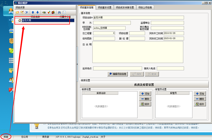 工程管理軟件中設置完成之后,重新登錄陳勝的賬戶,查看該員工的項目權限,項目維護中顯示的項目只有金石大樓這個項目