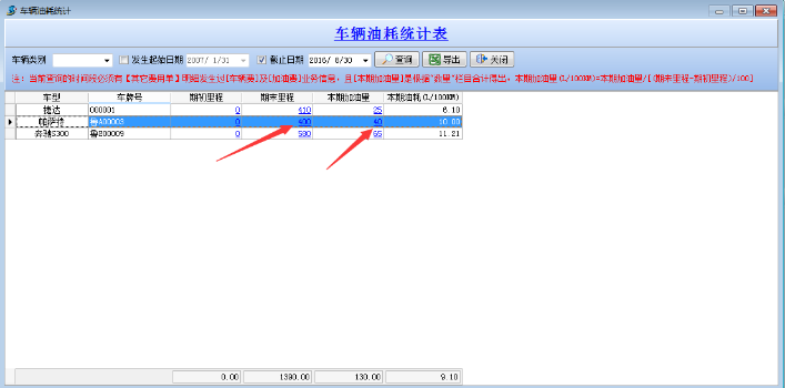 注:當(dāng)前查詢的時間段必須有【其他費(fèi)用單】明細(xì)發(fā)生過[車輛]及[加油費(fèi)]業(yè)務(wù)信息,且[本期加油量]是根據(jù)“數(shù)量”欄目合計得出,本期加油量(L/100KM)=本期加油量/[(期末里程—期初里程)/100]