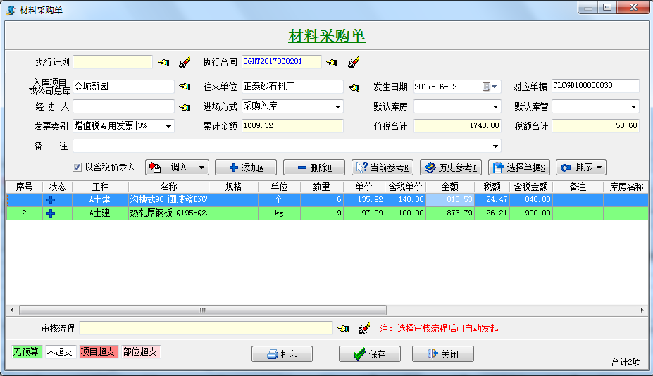 新建【材料采購單】,選擇執(zhí)行的合同,輸入實(shí)際的到貨量,入場的方式和倉庫,是否含稅等內(nèi)容