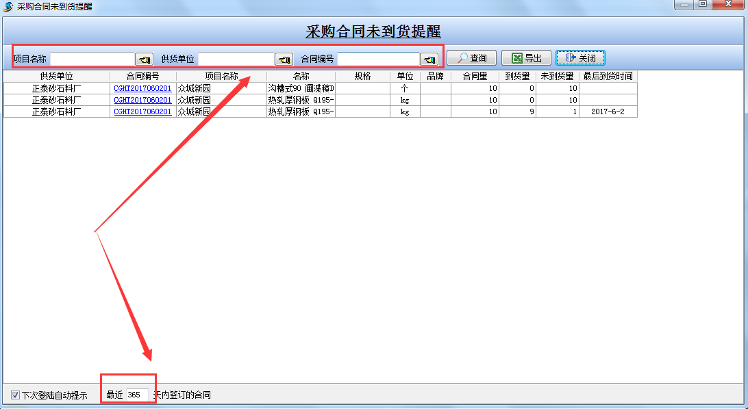 可根據(jù)項(xiàng)目名稱、供貨單位、合同編號(hào),按照時(shí)間檢索一定時(shí)間段內(nèi)的合同未到貨信息 如下圖: