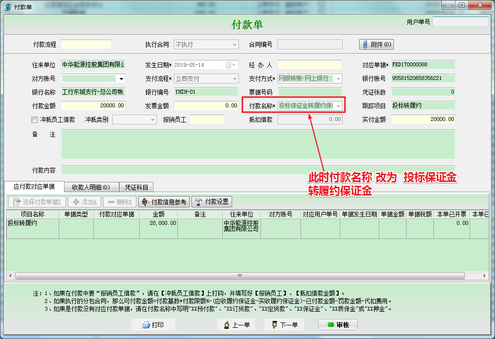 選擇結(jié)轉(zhuǎn)后,我們?cè)偃ゲ榭丛稑?biāo)保證金的付款單時(shí),發(fā)現(xiàn)付款名稱變?yōu)椋和稑?biāo)保證金轉(zhuǎn)履約保證金,如下圖所示,