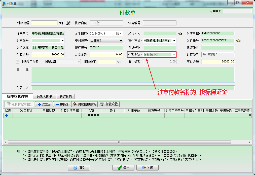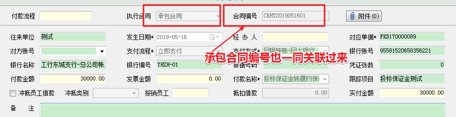 選擇對(duì)應(yīng)合同后,我們?cè)偃ゲ榭丛稑?biāo)保證金的付款單時(shí),會(huì)發(fā)現(xiàn),該付款單已經(jīng)與新建的承包合同關(guān)聯(lián)起來(lái)。
