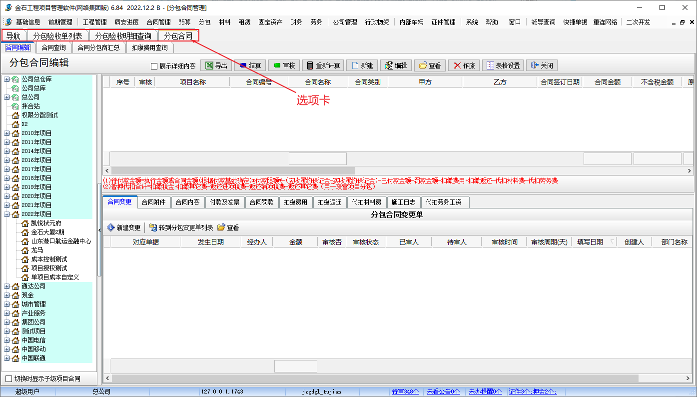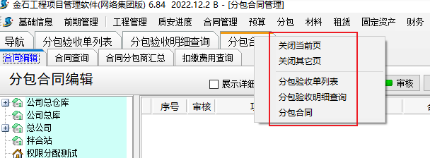 金石工程管理軟件新增導航、所有單據列表和合同新增選項卡的布局設置