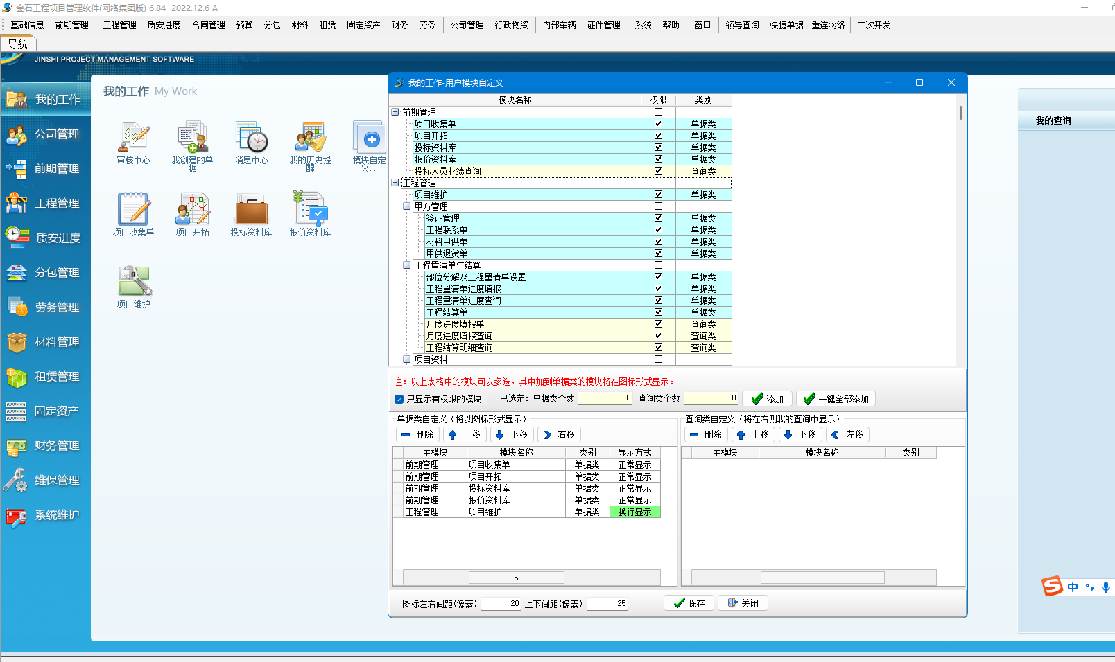 導航增加公司管理、前期管理、勞務管理、維保管理。導航界面可以調整顯示模塊。