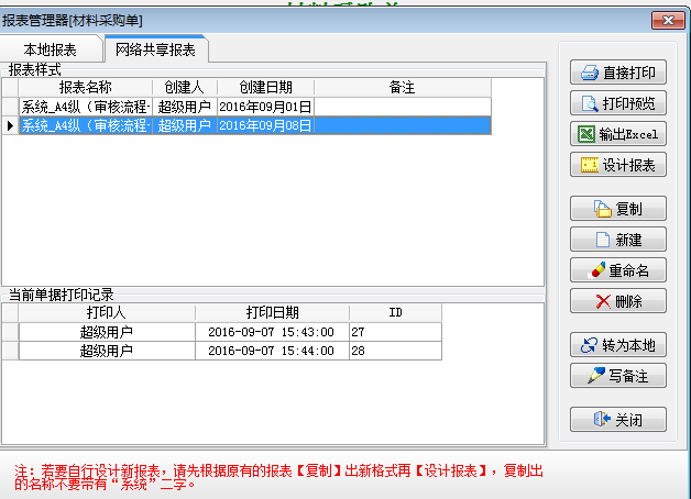 (1) 開啟【打印次數顯示】的單據報表設計只能由“超級用戶”來管理。
