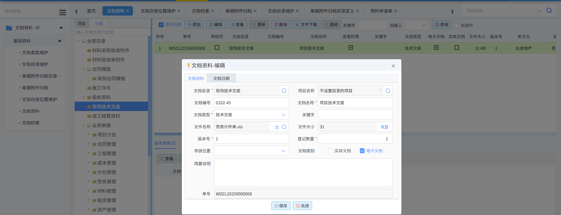 左側選擇目錄,點擊添加,輸入文檔名稱,選擇文檔類型,若是電子檔,勾選電子文檔,文件名稱處選擇文件上傳,輸入版本號等,如果是實體文檔,無需上傳文件,但需選擇存放位置,如下圖所示