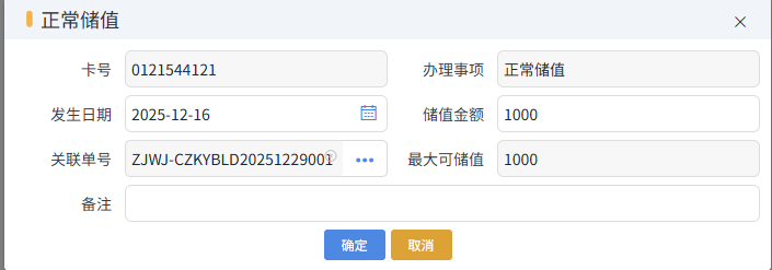 點擊添加,卡號,用途,建卡的方式,以及授權用戶,最后點擊確定完成建卡。只有審核完成后,才能進行儲值的動作,添加下方的正常儲值,就可以輸入本次充值的金額,關聯單號里選擇關聯的儲值卡預辦理單,如下圖所示,