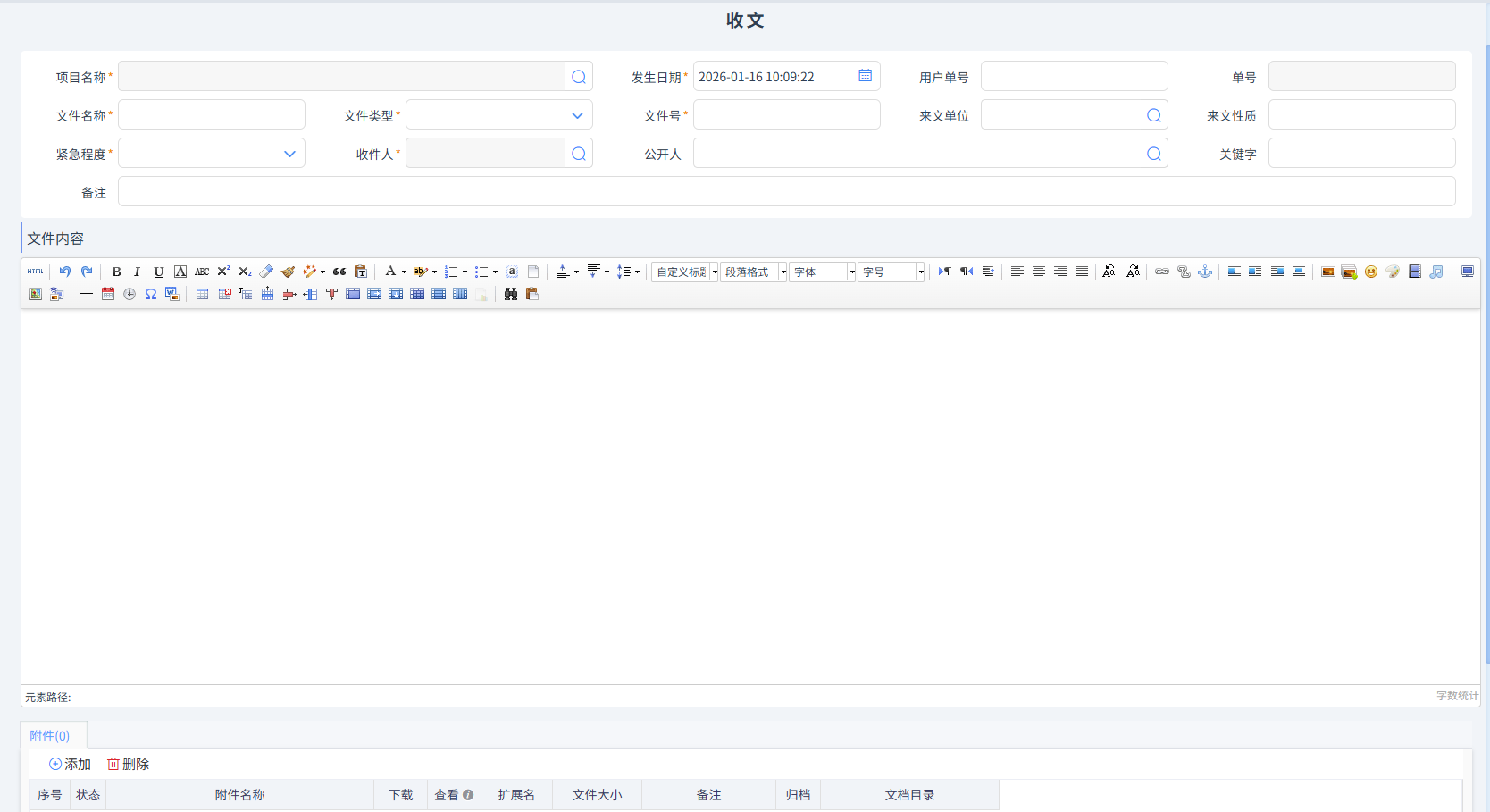 和收文類似,根據發文要求填寫文件名稱、文件類型、主送單位、擬稿人等,并附上發文電子檔,如下圖所示