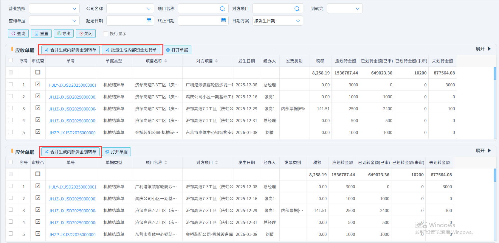 大部分內部業務是先有內部結算(如【機械結算單】、【周轉材結算單】、【費用分攤】、【材料調撥】、【工資分攤】、【項目補繳稅金】、【內部借款】、【內部還款】、【內部利息】)再以內部結算進行企業內部資金劃轉,每筆結算和劃轉必須是相同一個“營業執照”內不同機構或項目之間的內部往來,可規范內部資金流轉,確保資金調撥有跡可循、審批合規便于財務部門統一核算、對賬和資金管控。