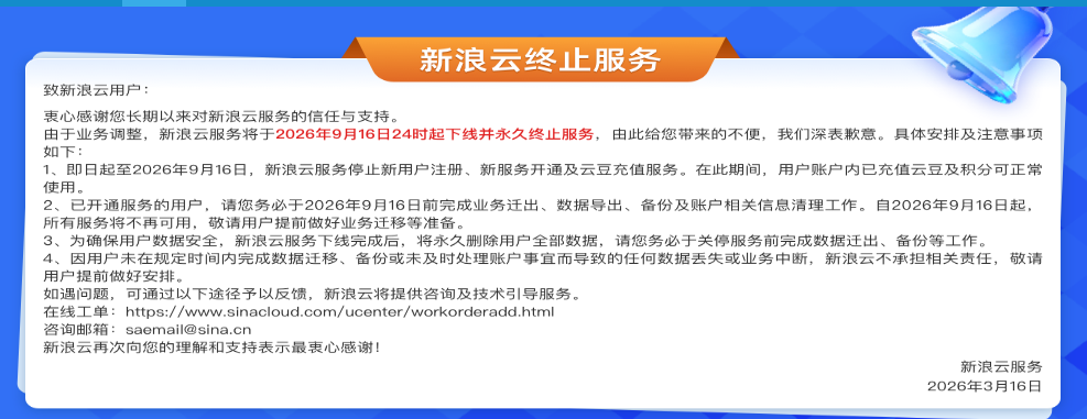 接新浪云(Sina App Engine)官方公告,因業務調整,新浪云服務已于近期啟動下線流程,并將于2026年9月16日永久終止服務。受此不可抗力影響,部署在新浪云環境下的我司產品 “金石云解析” 已無法正常提供服務,您的域名解析可能面臨中斷或不穩定的風險。