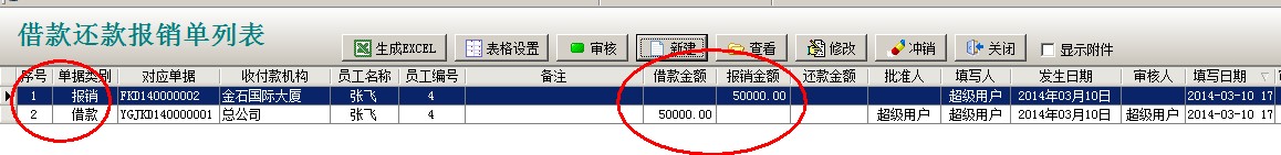 借還款單列表中2個(gè)單據(jù),一個(gè)是業(yè)務(wù)員(張飛)的借款,另一個(gè)報(bào)銷還款單據(jù),兩個(gè)單據(jù)抵消,業(yè)務(wù)員(張飛)就沒有欠款。還可以通過員工借款單統(tǒng)計(jì)查詢,財(cái)務(wù)管理模塊------相關(guān)查詢-----員工借款單統(tǒng)計(jì)。