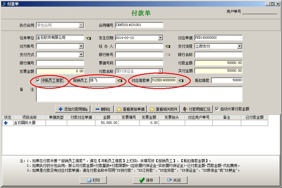 (3)最后做付款單沖抵員工借款,把當(dāng)時(shí)交納的保證金報(bào)銷出來。