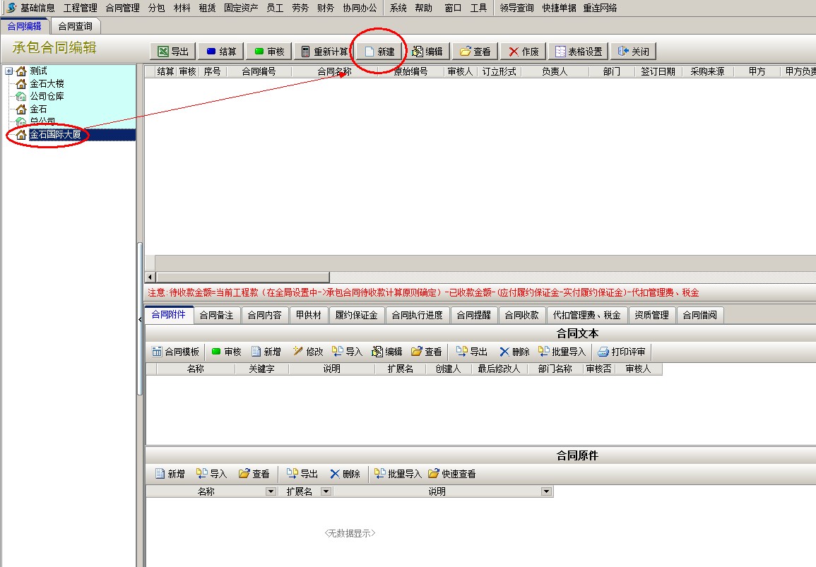 左邊選中新建的項(xiàng)目名稱金石國際大廈,右邊點(diǎn)擊新建,彈出新建承包合同窗口,錄入合同基本信息,填寫合同履約保證金金額,然后保存。